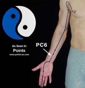 Pericardium 6 @ Nei Guan: Locate it in the middle of your wrist, two fingers down from the palm.